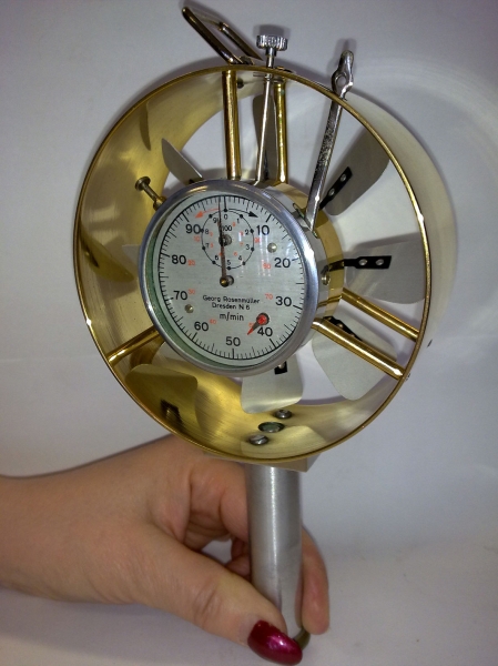 Starší německý anemometr pro měření rychlosti důlních větrů mino jiné i diferenciální metodou. K tomu účelu je ve spodní části zabudován větrníček s vlastním pohonem. OKD. Mosazné provedení. Průměr 10 cm, výška 19 cm. Výrobce pravděpodobně R. Fuess, Berlin. Plně funkční. Původní lak, nečištěný. Raritní sbírková záležitost.